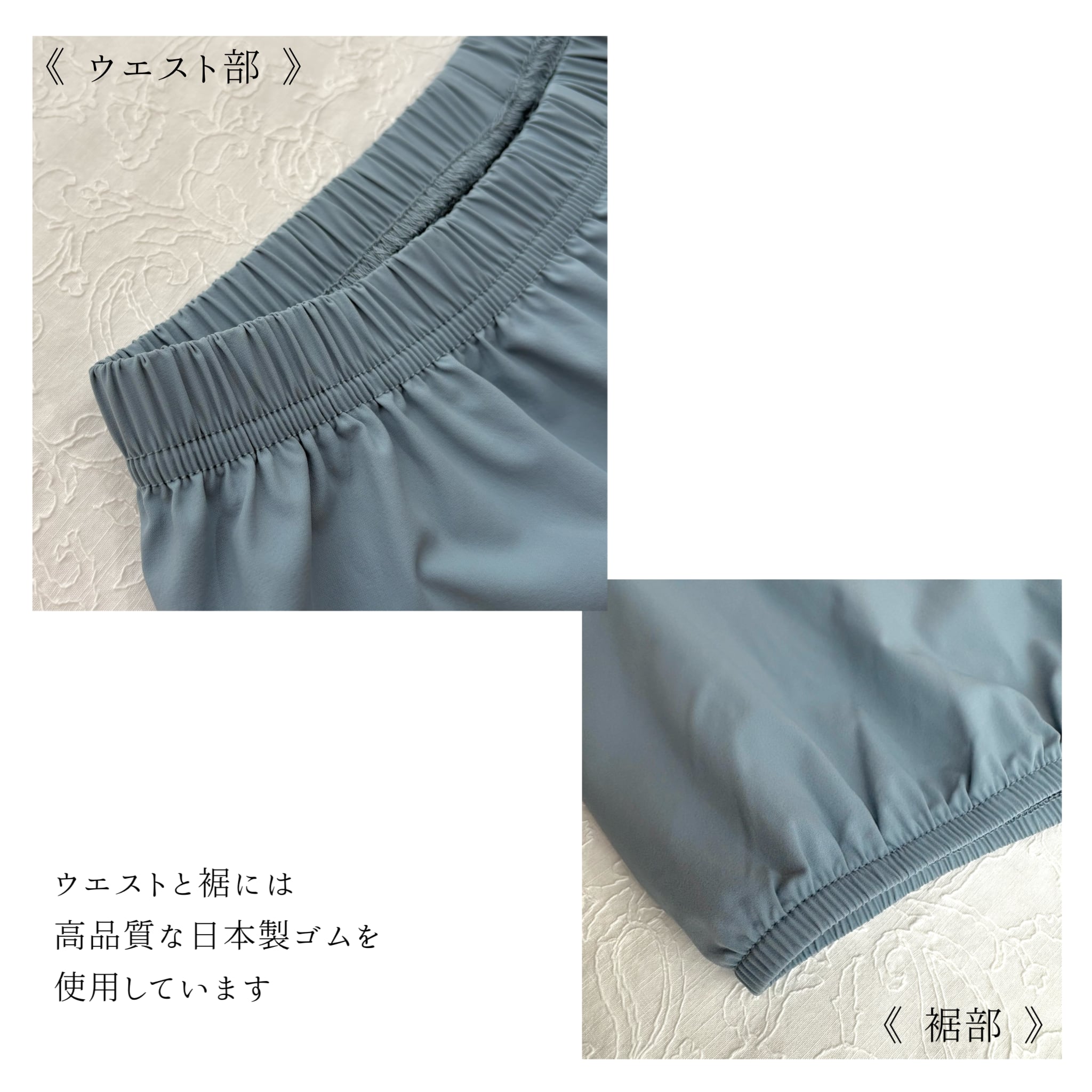 軽さ、取り扱いやすさ、お洗濯のしやすさ、幅広いアイテムと合わせやすいカラーこだわって厳選した生地を使用、ウエストとパンツ裾には縫い込みゴムを採用し、サッと着脱しやすくコンパクトに仕上げました。