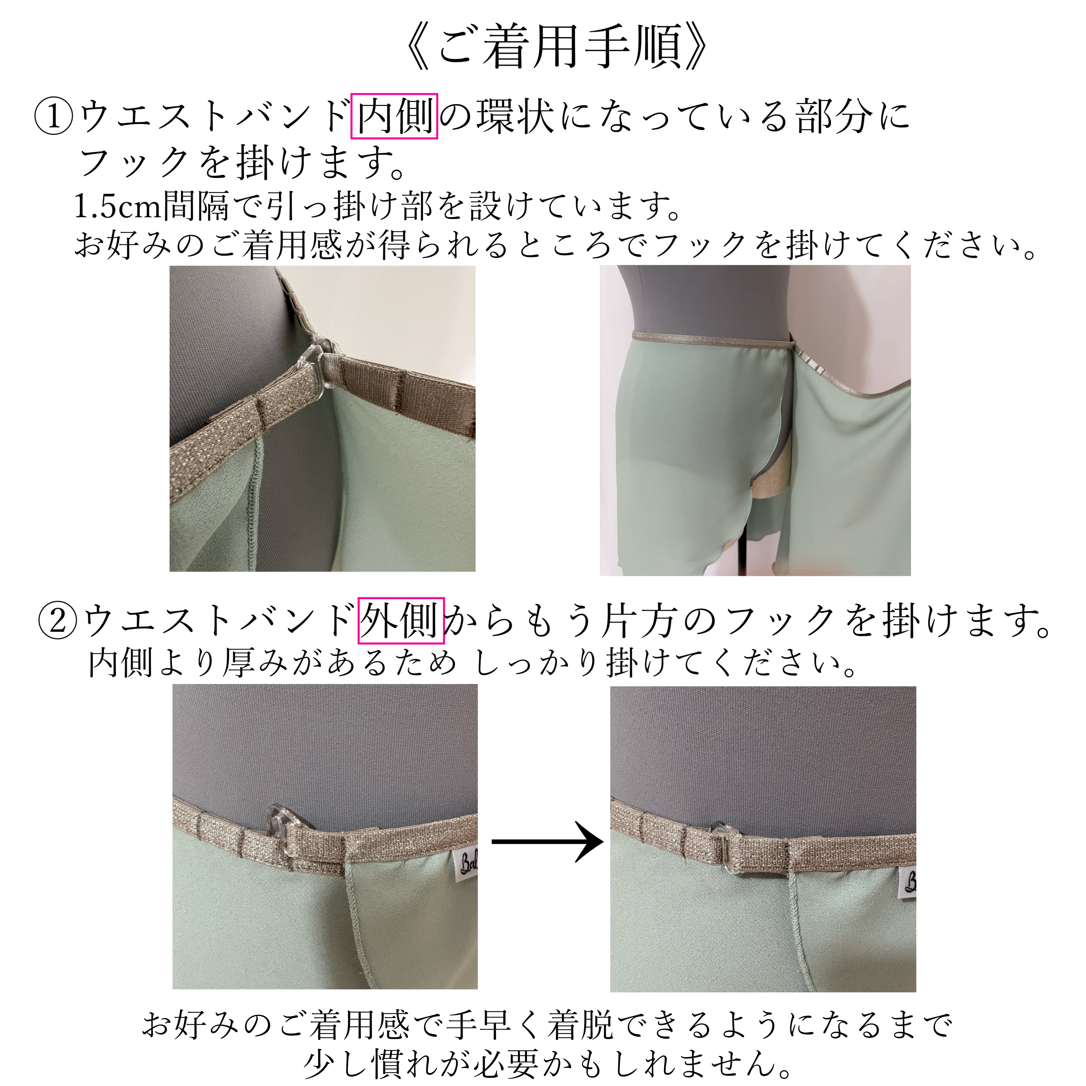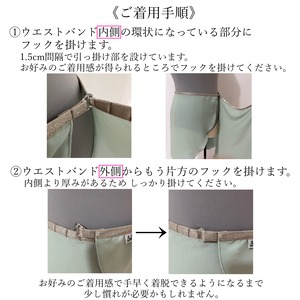 ウエストバンドの両端のフックを引っ掛けてご着用いただくタイプです。